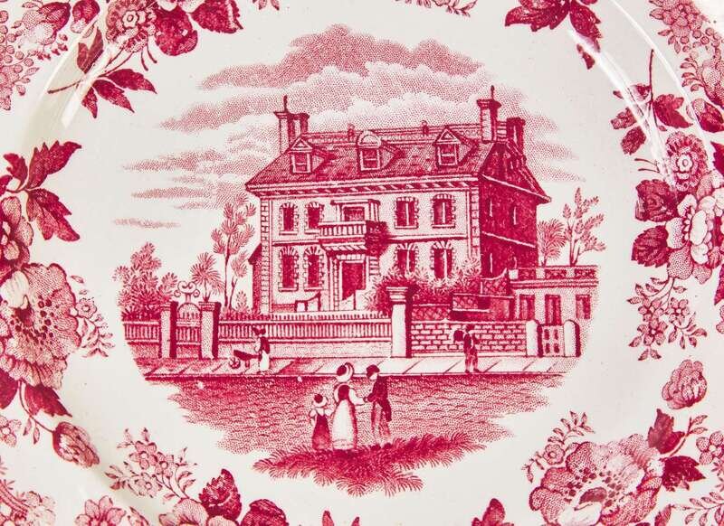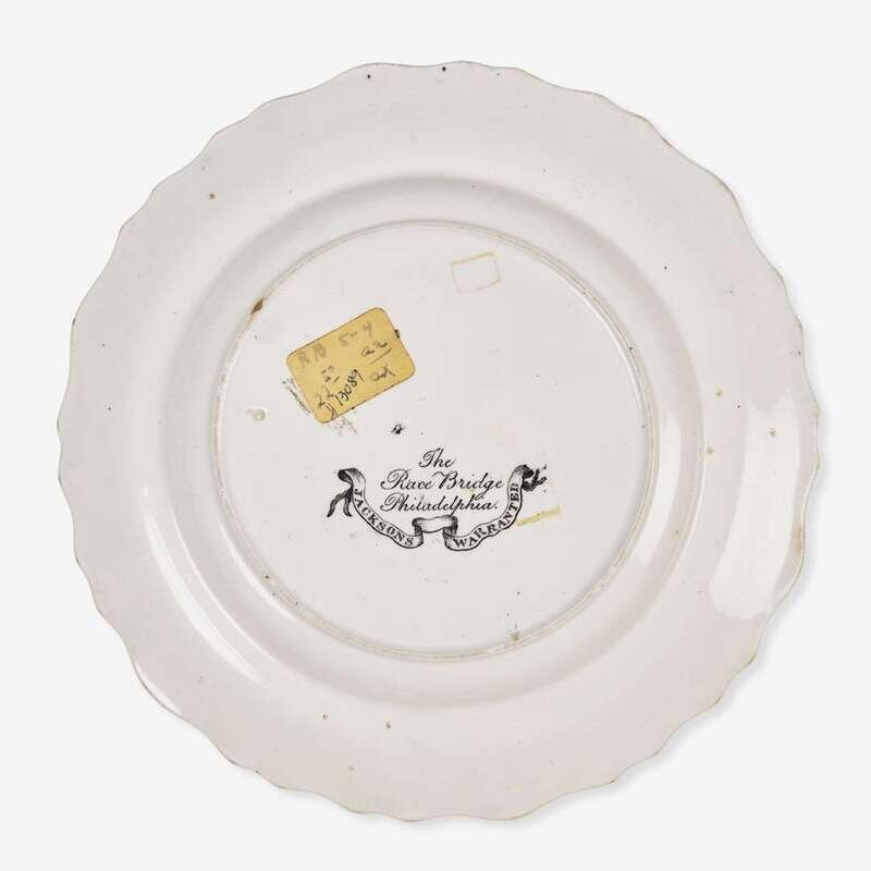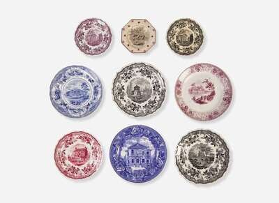 Including two plates, one in black, one in mulberry in "Girard's Bank, Philadelphia"; a black plate in "The Water Works Philadelphia"; a black plate in “The Race Bridge Philadelphia”; a Wedgwood blue transfer-printed commemorative plate in “Carpenter's Hall,” impressed “WEDGWOOD,” and marked underside; a blue transfer-printed plate in “Dumb Asylum"; a mulberry plate in “Schuylkill Water Works"; a red plate in “Hancock House, Boston”; and an octagonal child's “Franklin's Proverbs” plate with enamel details, depicting, “Three Removes Are As Bad As A Fire/ A Rolling Stone Gathers No Moss.”