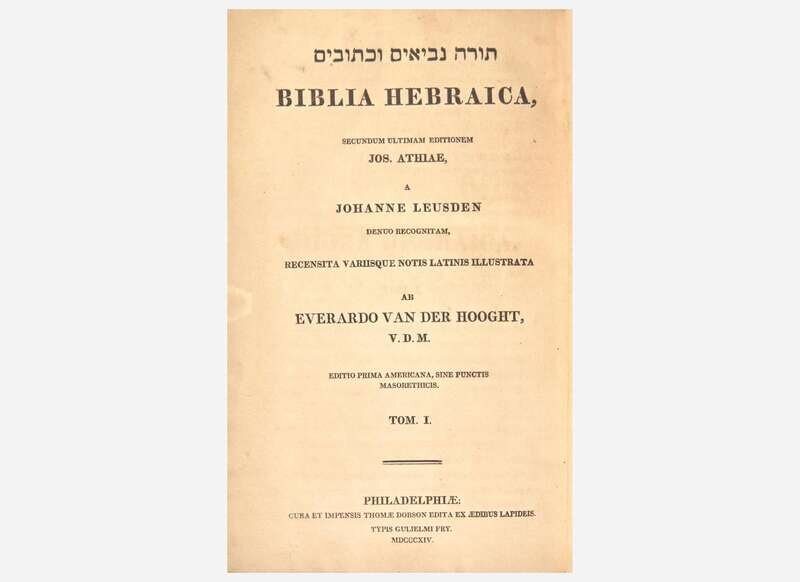 Based on the text of the 1705 Joseph Athias Bible (edited by Johanne Leusden with notes and preface by Everardo van der Hooght), the publication of this edition was initiated in 1812 by Polish emigre Jonathan Horwitz. Facing stiff competition from others seeking to be the first to publish the first complete Hebrew Bible in America, in 1813, Horowitz sold his type to William Fry and his list of subscribers and rights to Philadelphia publisher Thomas Dobson. Using Fry's type, Dobson published this edition the following year. According to Dobson's notice printed in the first volume of this set, the second volume was published a few months later, and included both title-pages and Van der Hooght's Preface, the latter of which is bound into this set's second volume.