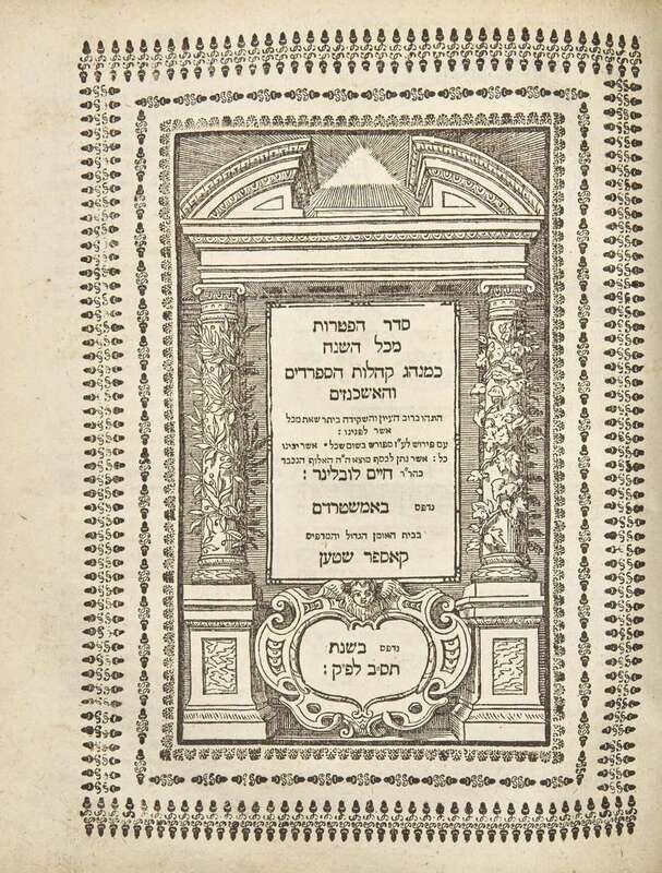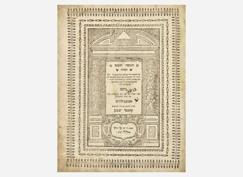 Amsterdam: Caspar Steen, 1702. Two parts in one volume, printing the Pentateuch, Five Megillot, and Haftorot. First edition. 4to. 407 leaves; lacking two leaves: 1-2, and 1-3. Printed in Hebrew with Yiddish paraphrase. Illustrated with two title-pages printed within architectural woodcut frame. Full contemporary brown calf, remnants of original clasps, rebacked, boards and extremities worn; all edges trimmed; endpapers renewed; light to moderate wear and soiling to text; scattered dampstaining along edges; scattered marginalia; old inscription on rear free endpaper. Fuks, Hebrew Typography 561; Roest, Catalog der Hebraica und Judaica p. 180; Zender 109