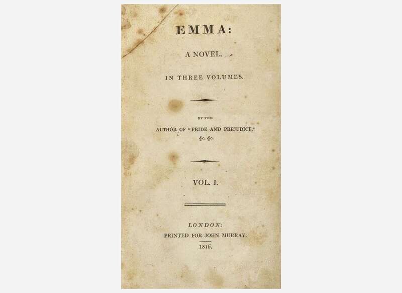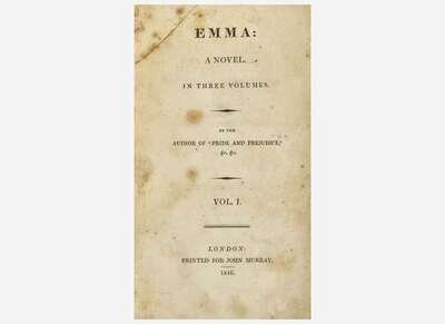 First edition of Austen's masterpiece, the last novel published by her during her lifetime. Written from January 1814 to March 1815, after several printing delays it was finally published that December, at Austen's own expense, in an edition of 2,000 copies.