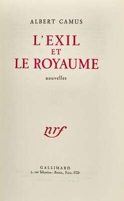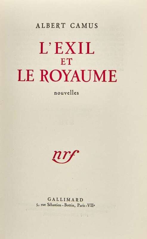 Paris: Gallimard, (1957). First edition, Service de Presse-copy (with "S P" perforated stamp at top of rear wrapper) . 12mo. Presentation copy, inscribed by Camus on half-title "a M. Claude Leslise / en sirene hommage / Albert Camus". Publisher's stiff wrappers, printed in red and in black, spine darkened, foxing to front and rear wrappers and spine; all edges untrimmed; foxing to text; closed tear in bottom corner of “Table” at rear; in quarter red levant and patterned paper slip case and chemise, by P. Goy & C. Vilaine.
