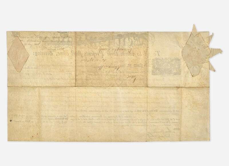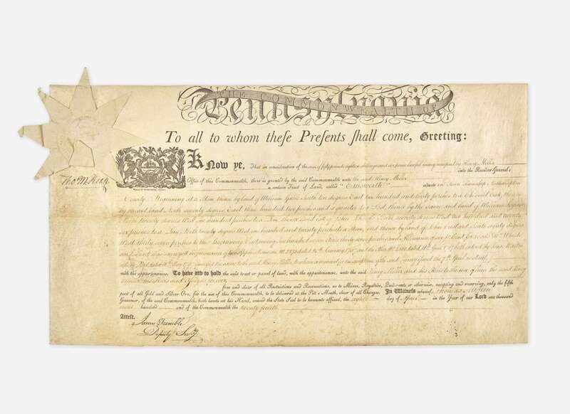(Philadelphia), Pennsylvania, April 8, 1800. Partially-printed document on vellum, signed by Signer of the Declaration of Independence from Delaware, Thomas McKean, as Governor of Pennsylvania, granting Henry Miller a tract of land, “Emsworth”, in Penn Township, Northampton County; counter-signed by James Trimble as Deputy Secretary. Printed by Francis & Robert Bailey. 11 x 20 in. (279 x 508 mm). Manuscript docket on verso, and additionally certified by engrosser of the Declaration of Independence, Timothy Matlack, to same. Three paper seals intact, in top left, and verso corners, some tips creased. Creasing from old folds. In mat with an engraved portrait of McKean and in frame, 21 1/8 x 38 7/8 in. (536 x 987 mm). From the Forbes Collection.