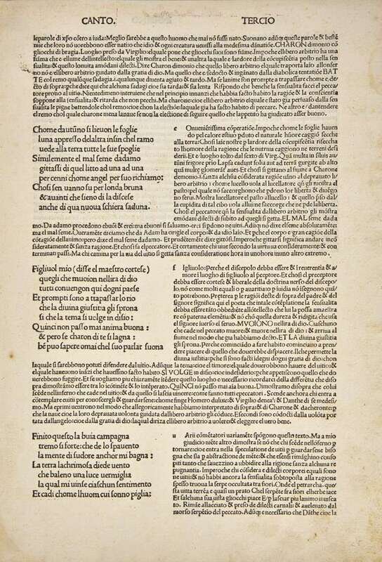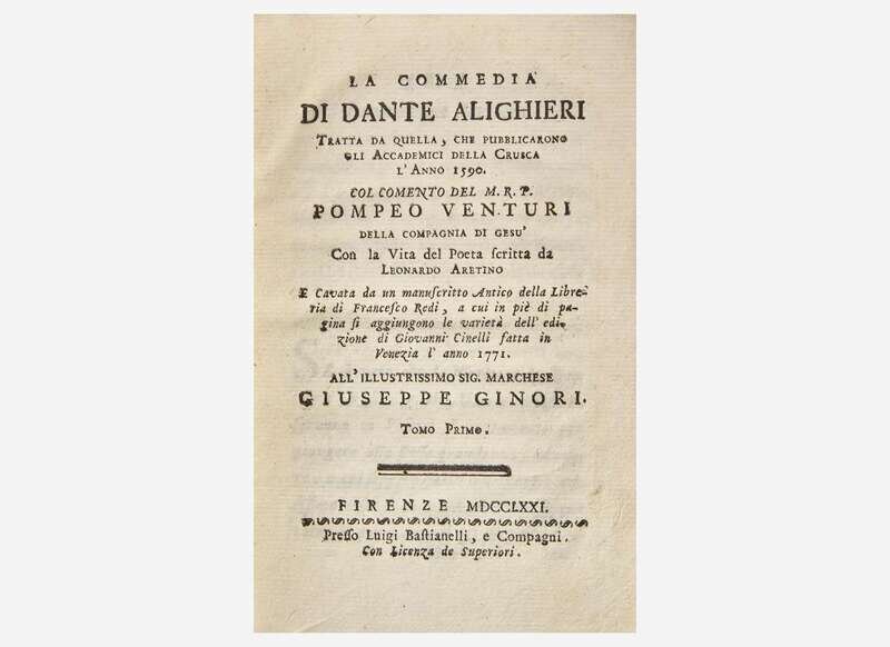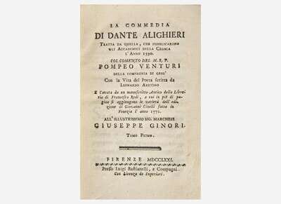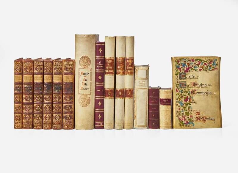 1. [Dante Alighieri]. La Commedia di Dante Alighieri… Florence: Luigi Bastianelli, 1771-74. In six volumes. 8vo. Full contemporary tan calf, morocco spine labels, stamped in gilt; edges stained red.