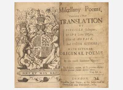 First edition of Jacob Tonson's influential verse miscellanies, published under the supervision of John Dryden, with some contributions from him and others. Features new translations of Virgil's Ecolgues, Ovid's Love Elegies, the Odes of Horace, and more. Dryden and Tonson would together publish an additional five miscellanies by 1709.