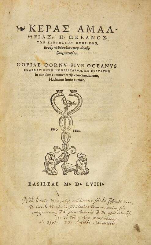 A handsome copy of Hadrianus Junius's Greek-language edition of Homer's Iliad and Odyssey containing the abridged commentaries of Byzantine Greek scholar Eustathius of Thessalonica, and with a preface by English scholar and president of Magdalen College, Oxford, Lawrence Humphrey.
