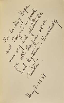Garden City: Doubleday & Company, Inc., 1951. First edition. 8vo. 214 pp. Presentation copy, signed and inscribed by Loos on front blank: “For darling Hope / and Edgar in fond / memory and gratitude / for all the fun we’ve / had together. Devotedly / Anita. / May 8-1951”. Illustrated by Federico Pallavicini. Original light blue cloth, stamped in pink and in black, in original illustrated dust-jacket, lightly worn; top edge stained pink, other edges trimmed; pink illustrated endpapers. A lovely copy.