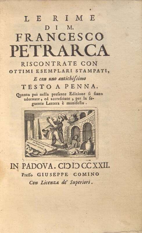 Padua: Giuseppe Comino, 1722. 12mo. (xii), civ, 397, (3) pp. Full contemporary vellum over boards, title in manuscript on spine; red marbled edges; large engraved portrait of Petrarch mounted to front paste-down.