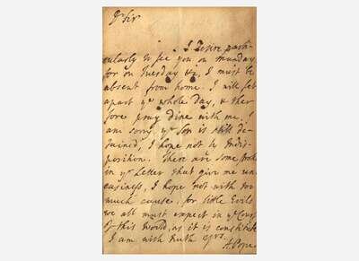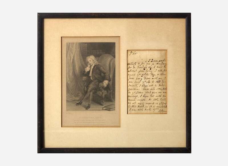 No place, no date (presumably Twickenham, ca. 1721). One sheet folded to make four pages, 6 1/8 x 4 in. (155 x 102 mm). One-page autograph letter signed by Alexander Pope to Jonathan Richardson: “I desire particularly to see you on Munday (sic), for on Tuesday &c, I must be absent from home. I will set apart ye whole day, & therefore pray dine with me. I am sorry yr. Son is still detained, I hope not by Indisposition. There are some strokes in yr. Letter that give me uneasiness, I hope not with too much cause, for little Evils we all must expect in the Course of this World, as it is constituted. I am with truth yrs. A. Pope.” Addressed by the Pope on verso, “To Mr. Richardson at his house in Queens Square Bloomsbury”; postmarked, wax seal intact. Creasing from old folds; very lightly affected by damp at center of letter, same lightly toned; old stub adhered to left side. In mat and in frame with an engraved portrait of Pope, 13 1/2 x 14 3/4 in. (343 x 375 mm). Printed in The Correspondence of Alexander Pope, Volume II 1719-1728, p. 61.