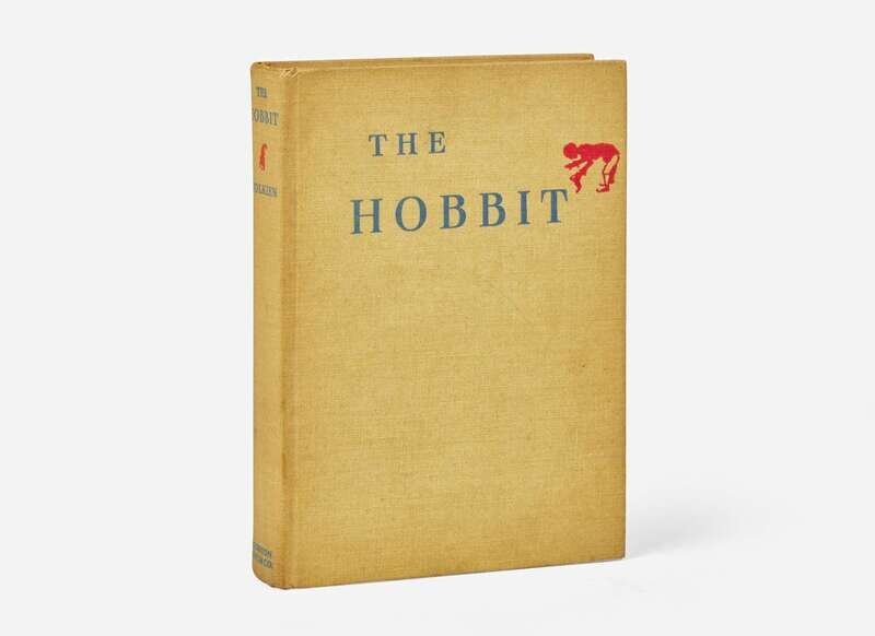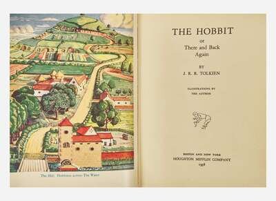 Boston and New York: Houghton Mifflin Company, 1938. First American edition, first impression (with bowing hobbit decoration on title-page). 8vo. 310 pp. Illustrated with a color frontispiece, three color plates, and 9 black and white illustrations, by Tolkien. Publisher's tan cloth, stamped in blue and in red, slightly cocked, scattered other very light soiling to boards and spine; all edges trimmed; illustrated endpapers; book-plate on verso of frontispiece; dust-jacket wanting. Hammond and Anderson A3b1