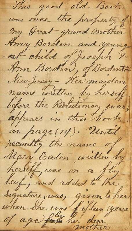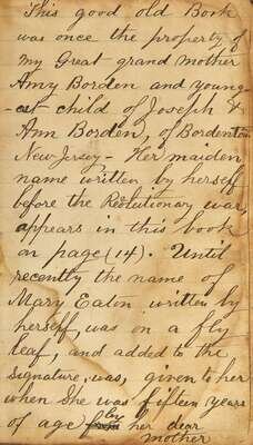 A lengthy description bound in at front, written by Borden descendant Isaac Eaton Chandler (great-great grandson of the family's patriarch), explains this volume's lineage, noting that it “was once the property of my Great grand mother Amy Borden and youngest child of Joseph & Ann Borden, of Bordentown New Jersey…[Amy] gave it to her daughter Mary [Potts Eaton] who in turn gave it to her daughter Mary [Eaton Chandler]…” The book is then traced from Mary Eaton Chandler, to her son, the aforesaid Isaac, ca. 1857, thence to his son, George Allen Chandler, in 1894, and then to his daughter, Gertrude Chandler, in 1914. Explaining the condition of the volume, Isaac notes that it “went through the great Johnstown Flood of May 31st 1889, as its appearance denotes.”