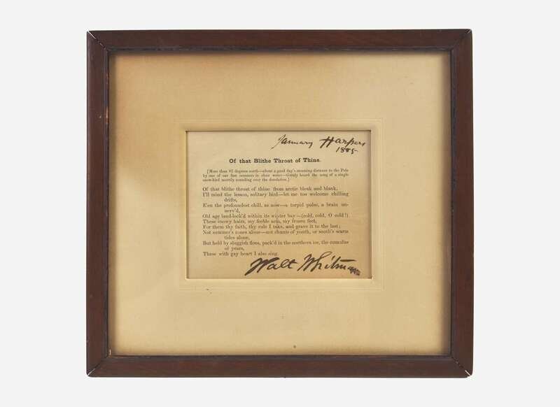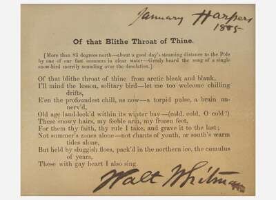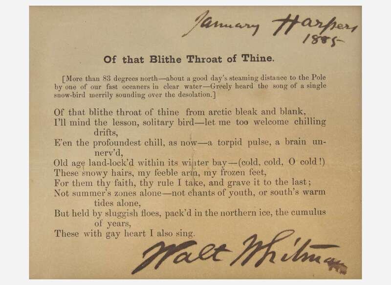 No place, ca. 1884. Printed sheet of Whitman's poem “Of that Blithe Throat of Thine”, boldly signed by Whitman at bottom, and dated and notated by him at top “January Harpers 1885”; 7 7/8 x 6 in. (200 x 152 mm). Mounted to card; sheet unevenly toned. In mat and in frame, 11 x 12 in. (279 x 305 mm). Myerson F49, second state (without printed signature)
