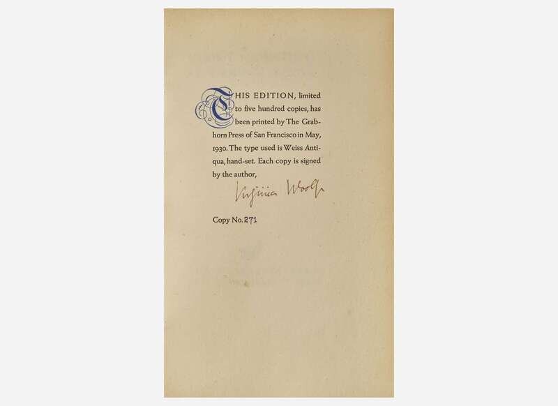 San Francisco: The Westgate Press (printed by the Grabhorn Press), 1930. First and limited edition, #271/500 numbered copies signed by Virginia Woolf. 8vo. (iv), 35, (1) pp. Publisher's quarter blue crushed morocco over grey patterned paper-covered boards, stamped in blind and in gilt, boards bowed, spine faded, spine ends worn, corners lightly worn, upper rear corner bumped; all edges trimmed; original slip case wanting. Kirkpatrick A13A