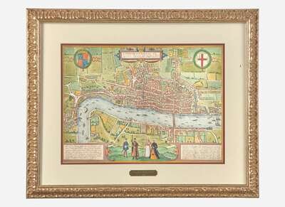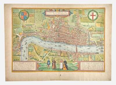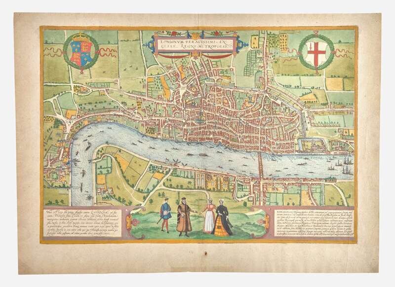 (Cologne, 1574). Engraved hand-colored map. Second state (with “Westmester” changed to “Westmuster" and the Royal Exchange inserted). Latin text on verso. 15 1/2 x 21 1/2 in. (394 x 546 mm). A few scattered very small repaired holes, with painted infilling; small rust burn at bottom center recto, sello tape along verso edge below same. In mat and in frame, 23 1/2 x 29 in. (597 x 737 mm). Howgego 2