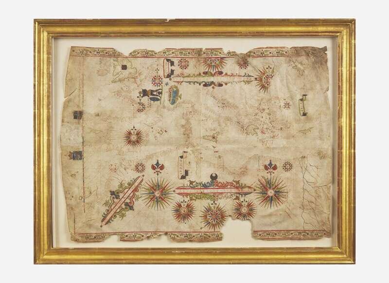 Marseille, 1615. Illuminated manuscript portolan chart on vellum, in red, blue, green, and sepia inks, heightened in gold; 16 wind compasses; three large scale bars; within foliate border at top and bottom edge; place names executed in a small neat hand in red and sepia inks; shield with royal arms of France at left, shield with arms of Marseille at same; shield with Cross of St. George at left; verso blank; 30 3/4 x 22 in. (781 x 559 mm). Inscription in upper left-hand corner, “Joannes Oliva fecit in Civitate Marsilier ano domini 1615”. Scattered losses, closed tears, and wear along edges; loss in left and right edges affecting compasses and foliate border; residue in top center edge from sometime removed paper; bottom right edge worn and browned; old central horizontal crease; scattered soiling and surface wear; scattered fading to ink; some faint offsetting from when folded. Professionally mounted with ties at outer edges. In gilt frame, 36 1/4 x 27 5/8 in. (921 x 702 mm). Astengo, The Renaissance Chart Tradition in the Mediterranean, p. 233 (this chart mentioned in note 347); Julio Rey Pastor and Ernesto Garcia Camarero, La Cartografia Mallorquina, Madrid, 1960, pp. 137-144; Marcel Destombes, “Francois Ollive et l'Hydrographie Marseillaise au XVII”
