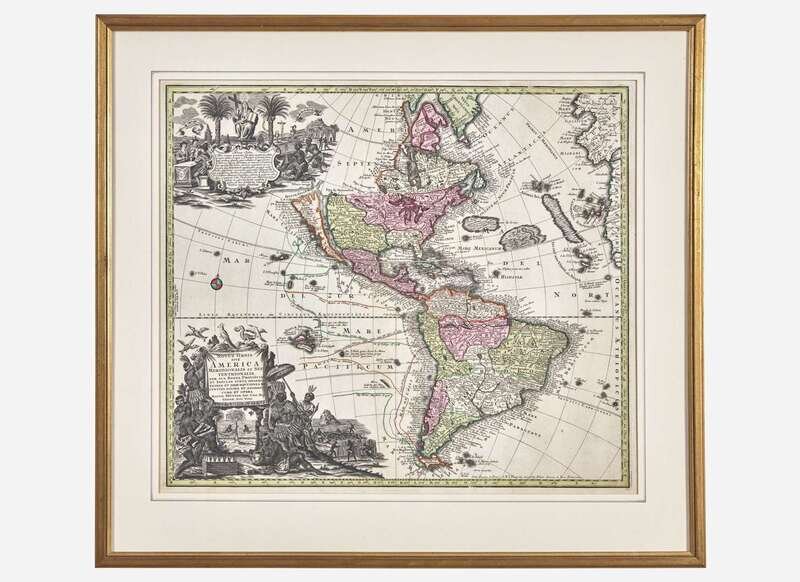 Augsburg, ca. 1730. Engraved hand-colored map of the Americas. Mounted to board along edges; creasing from old folds; contemporary manuscript number in top right corner; light soiling in margins. 20 1/4 x 23 5/8 in. (514 x 600 mm) (sight). In mat and in frame, 27 x 30 in. (686 x 762 mm). Tooley 91