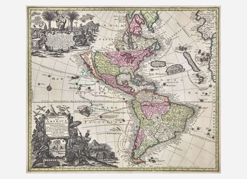 Hand-colored engraved map of North and South America, with California depicted as an island, and two large elaborately illustrated cartouches. “Based on the Sanson-Homann formula but with additions, several rivers are inserted on the west coast and two mountains in the north…The tracks of the early navigators are shown in the Pacific…” (Tooley)