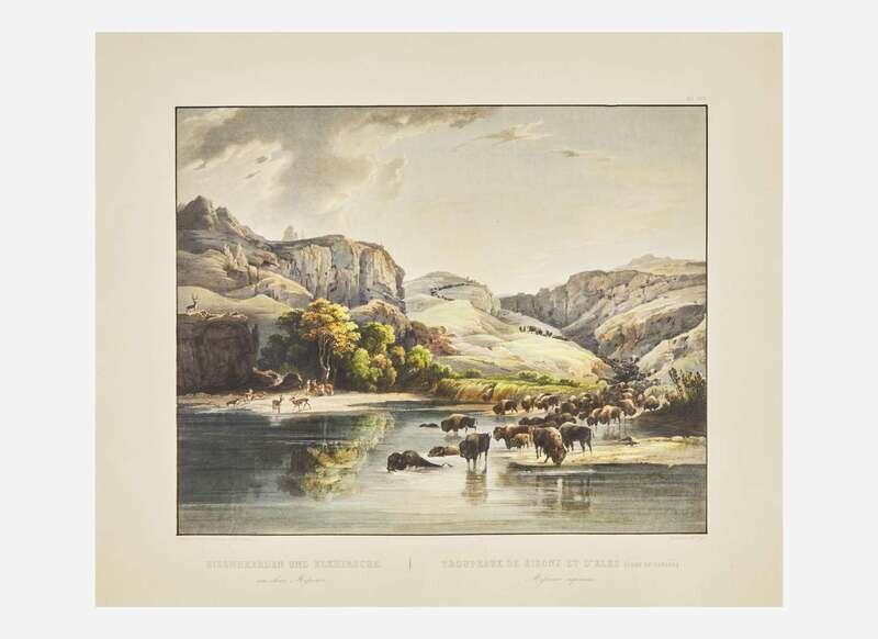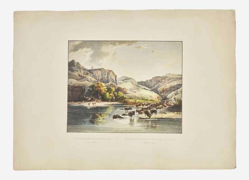 (Coblenz: J. Holscher/London: Published by Ackermann & Co./Paris: Arthus Bertrand, 1839-42). Tab. XLVII. Hand-colored aquatint engraving by Vogel after Bodmer; “C. Bodmer” blindstamp below title. 17 1/2 x 24 1/2 in. (432 x 622 mm). Light edge wear. Graff 4648; Howes M-443a; Pilling 2521; Sabin 47014; Wagner-Camp 76:1