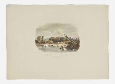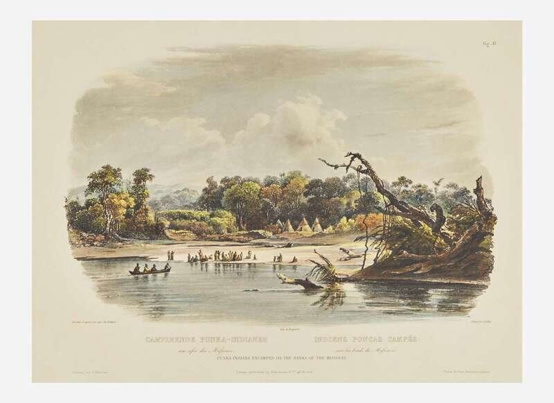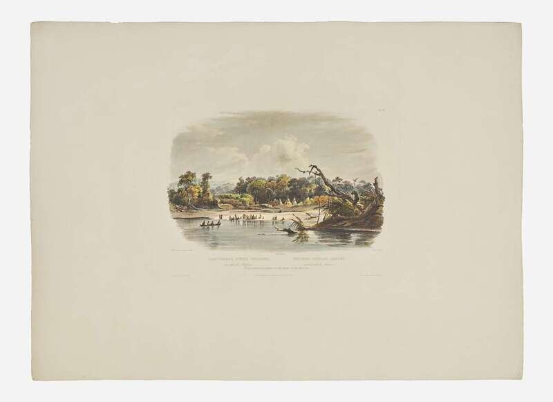 Coblenz: J. Holscher/London: Published by Ackermann & Co./Paris: Arthus Bertrand, (1839-42). Vig. XI. Hand-colored aquatint engraving by Salathe after Bodmer; “C. Bodmer” blindstamp below title. Faint dampstaining in top margin. 18 x 24 3/4 in. (457 x 629 mm). Graff 4648; Howes M-443a; Pilling 2521; Sabin 47014; Wagner-Camp 76:1