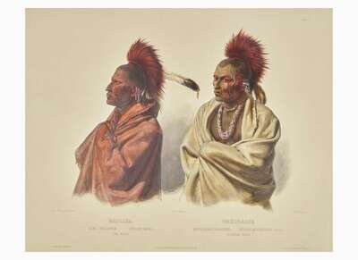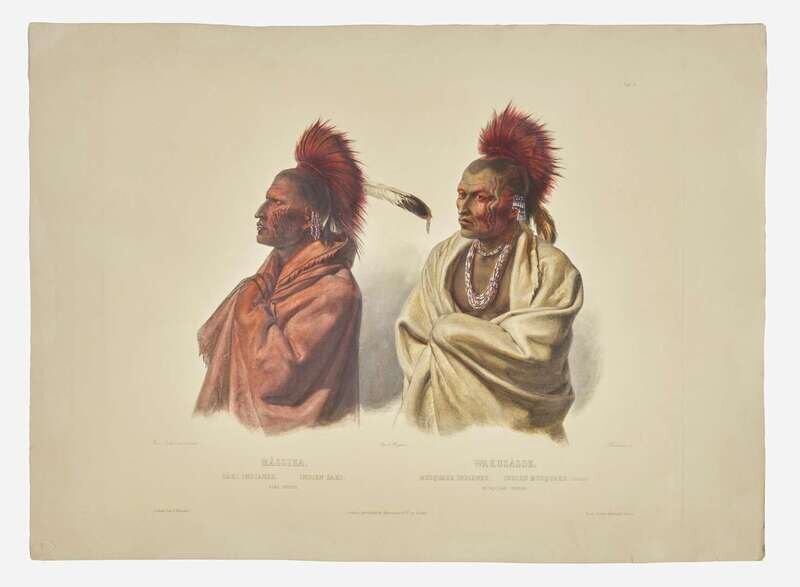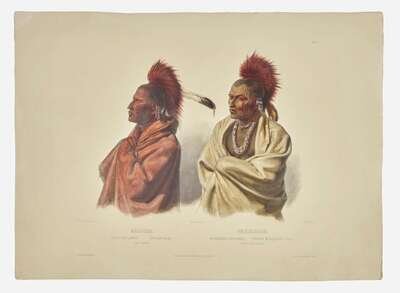 A vibrant double portrait of warriors Mássika of the Saki, and Wakusásse of the Musquake, sketched by Bodmer in St. Louis while making the final arrangements for his trip up the Missouri River. From Bodmer's Travels in the Interior of North America.