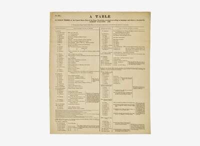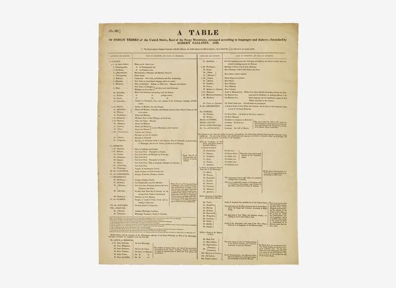 A fine and rare chart mapping the languages of Native American tribes in the United States. Conceived by Swiss-American politician, diplomat, and Secretary of the Treasury under Jefferson, Albert Gallatin (1761-1849), this chart lists 102 Native tribes, grouped by languages and geographic locations. The chart's creation was prompted by a combination of Gallatin's long engagement with linguistic research and as a result of the United States’s policies of forced Native removal from ancestral homes. Gallatin’s work was encouraged by scientists like Alexander von Humboldt and Peter Stephen Du Ponceau, and working through the War Department, Gallatin secured $2,000 in funding from the U.S. government to research Native American languages.