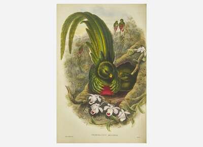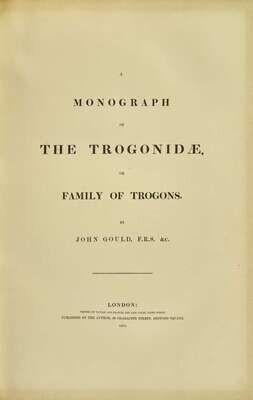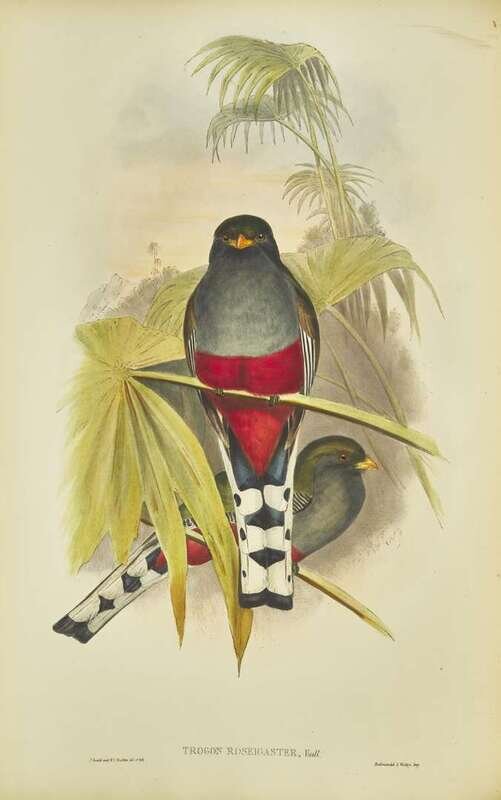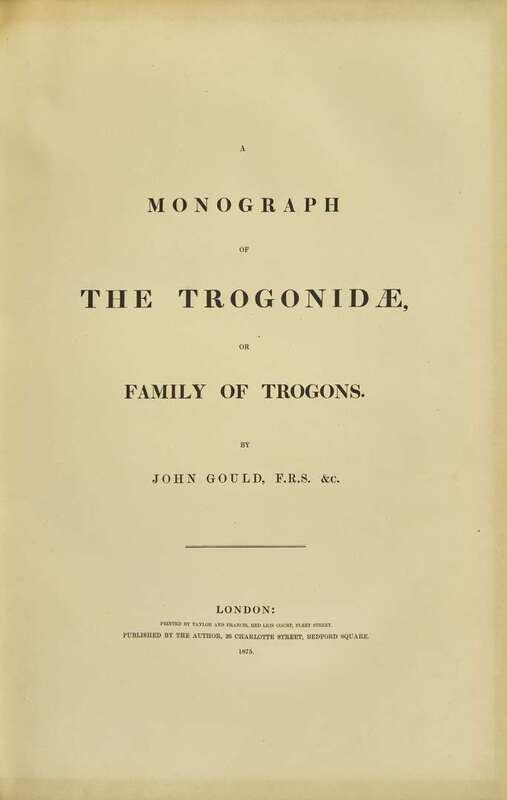 A fine example of this expanded and revised edition of John Gould's work on these exotic and brilliantly colored tropical rain forest birds, considered one of the most beautiful ornithological works ever produced. Named after the Greek word for nibbling, and referring to their tendency to gnaw holes in trees to make their nests, trogon and quetzal birds are found worldwide, most notably in South America. Amounting to 46 species in seven genera, they are known for their brightly colored feathers and red, green, and yellow breasts, faithfully reproduced here in 47 dazzling hand-colored lithographs. Although Gould first published his account of the family of trogons in 1836 and 1838, he writes in the preface of this second edition that it "is in reality a new publication, all the plates having been redrawn, and many new species figured for the first time." Likewise, this work is enriched with the inclusion of 12 birds not found in his first account.