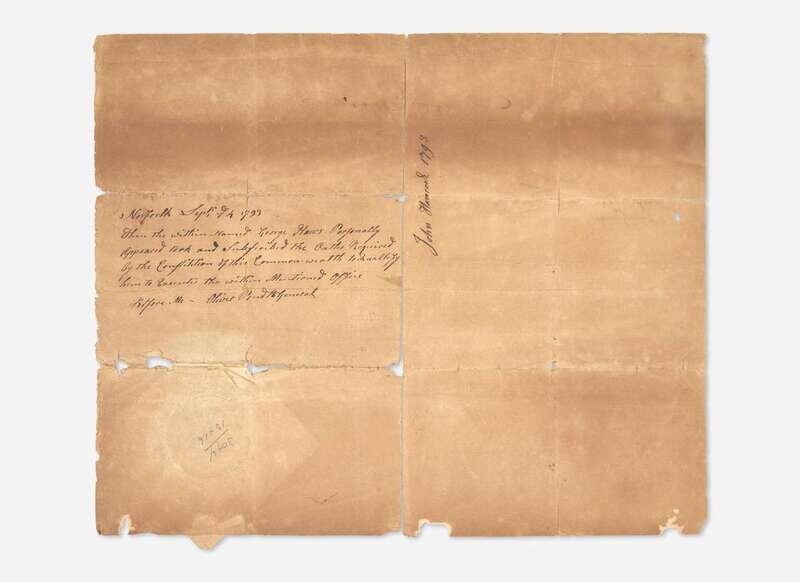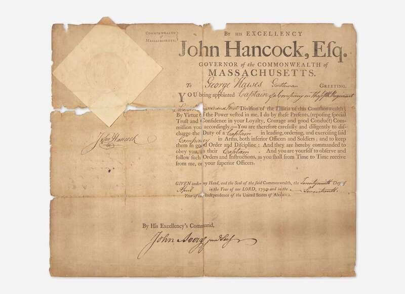 Massachusetts, April 29, 1793. Partially-printed military commission, signed by John Hancock as governor of the Commonwealth of Massachusetts, for George Hawes, appointing him “Captain of a Company in the fifth Regiment” of the Massachusetts militia; counter-signed by Secretary John Avery; inscribed on verso by General Oliver Pond, affirming Hawes took his oath, dated Norfolk, September 4, 1793. Large paper seal intact in top left. Creasing from contemporary folds; separated along central vertical fold; top left quadrant separated along folds; small loses along folds, affecting some printed and manuscript text; scattered losses and wear along edges; unevenly toned, recto and verso. 12 1/4 x 14 3/4 in. (311 x 375 mm). In frame.