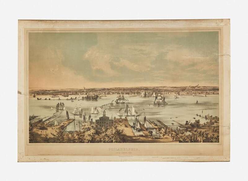 A scarce large-format panoramic view of Philadelphia during the height of the Industrial Revolution. A scene of bustling energy, the view looks west from Camden, New Jersey across the Delaware River. In the foreground can be seen the line of piers of Market Street ferry house, docked with ships and steamboats, and with workers on foot and horse-drawn carriages loading various goods. The Delaware River is seen thronged with ships, highlighting Philadelphia's role as a center of commerce and trade. In the middle ground, Windmill Island is shown, only recently dredged to create a channel for the passage of ferries from Camden. The city's dynamic waterfront and urban landscape is shown, with landmarks such as Independence Hall, Christ's Church, Girard College, the Navy Yard, Spark's Shot Tower, among others. In the far background can be seen the Schuylkill River, and further out into West Philadelphia and undeveloped country.