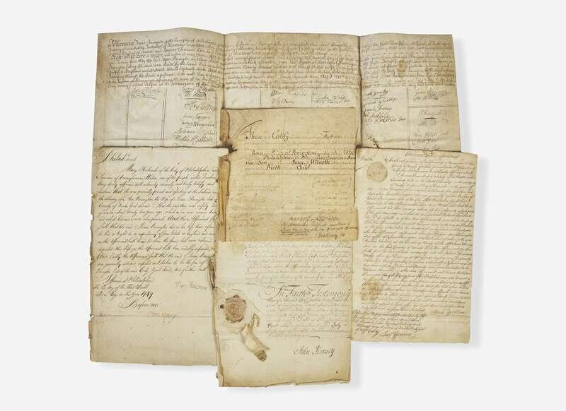 Philadelphia, October 13, 1700. Single vellum sheet, 9 x 9 1/2 in. (229 x 241 mm). Manuscript birth certificate for Isaac Penington, signed by William Penn, his daughter Letitia Penn, his wife Hannah Penn, and eight others; manuscript in the hand of John Kinsey at bottom, affirming that the “above written Certificate was Shewn to James Logan Esq at the time of taking the affirmation hereunto annexed”. Creasing from old folds; some loss in top left, but not affecting manuscript or signatures; scattered minor soiling. In blue levant chemise,