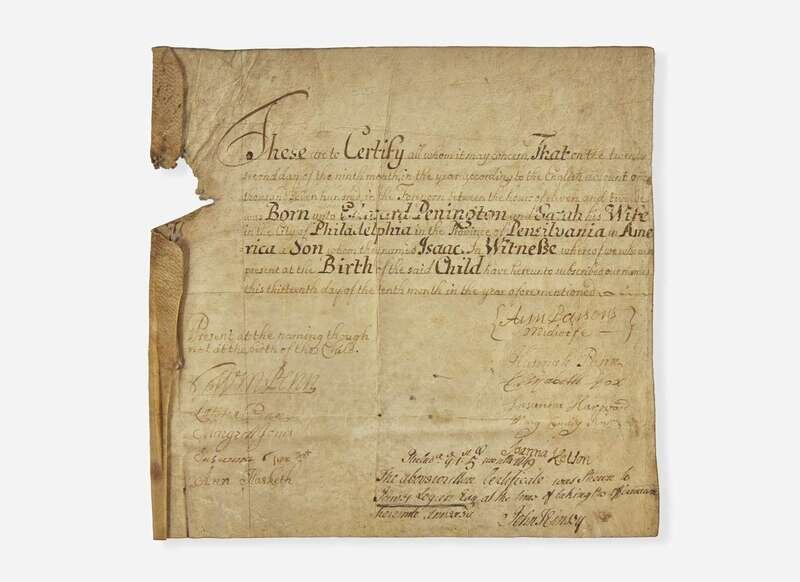 Founder of Pennsylvania William Penn signs the birth certificate of Isaac Penington (1701-42), son of Surveyor General of Pennsylvania Edward Penington (1667-1701). Penn and the Penington family had close ties that reached across generations. Isaac's grandfather, also Isaac (1616-79), was a respected English Quaker and author, whose home in Woodside, Amersham, was a frequent meeting place for many leading Quakers, including Penn and George Fox, and whose writings on Quakerism were very influential. In 1672, Penn married Gulielma Springett (1644-94), daughter from the first marriage of Isaac’s wife, Mary Penington. When King Charles II chartered the colony of Pennsylvania the Penington family bought land and emigrated to the new colony where they established deep roots. Upon Penn's second and final trip there, in 1698, he was accompanied by the aforementioned Edward Penington, father of the above Isaac.