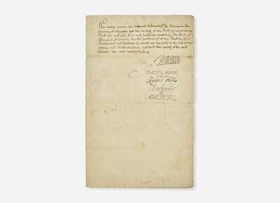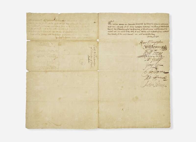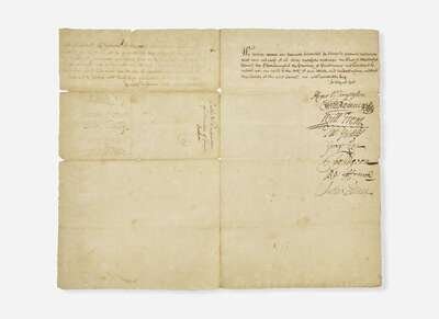 No place, no date (Philadelphia, ca. February-September 1704). One sheet folded to make four-pages, 12 5/8 x 8 in. (321 x 203 mm). Two-page manuscript document, signed by William Penn, Jr., James Logan, Isaac Norris, and ten other members of the “Council for the Government of the Province of Pensilvania and Territories”. Manuscript on rectos only; docketed on verso, “Oaths & Declarations / of Members of Council / Stenton”. Creasing from contemporary folds, small separations at same. From the Jay T. Snider Collection.