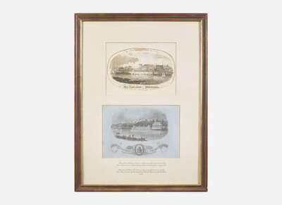 Philadelphia, 1839-77. Two partially-printed documents, signed in various manuscript on verso, being Fire Association of Philadelphia policies (Nos. 6361 and 76328) in the amounts of $10,000 and $5,000, for The Preston Retreat; signed on verso by the attorneys of financiers Alexander and Francis Baring, William Bingham, etc.; blindstamp of The Preston Retreat in top left of top document. Creasing from old folds. Each document in single mat and unexamined out of frame, 25 x 18 3/4 in. (635 x 476 mm).