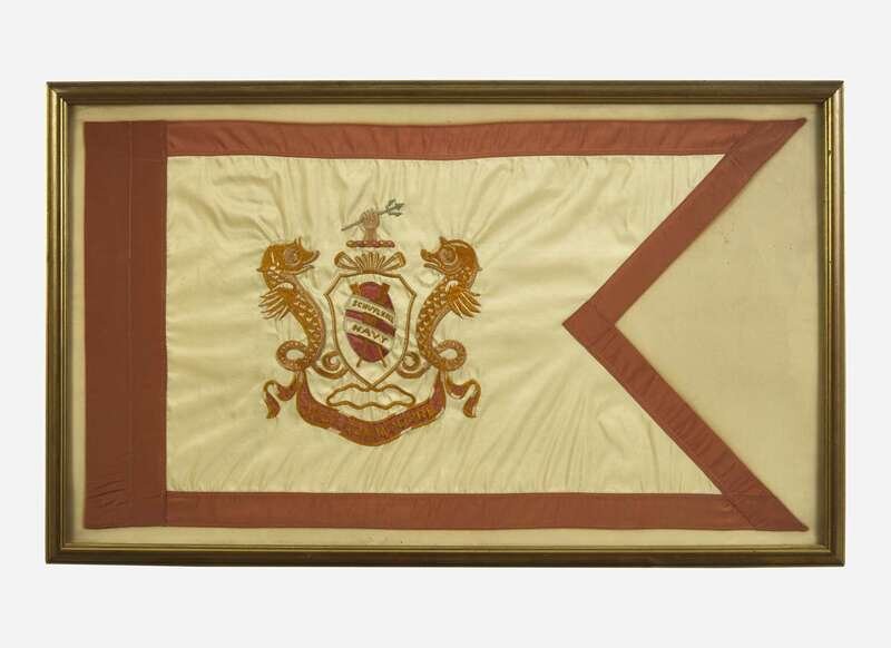Philadelphia, ca. 1930s. Silk swallowtail pennant flag, with red border and Schuylkill Navy coat of arms at center; “Vice Commodore” stitched in gold below same. Approximately 18 1/4 x 32 1/4 in. (463 x 819 mm). In frame, 21 5/8 x 35 1/2 in. (549 x 902 mm).
