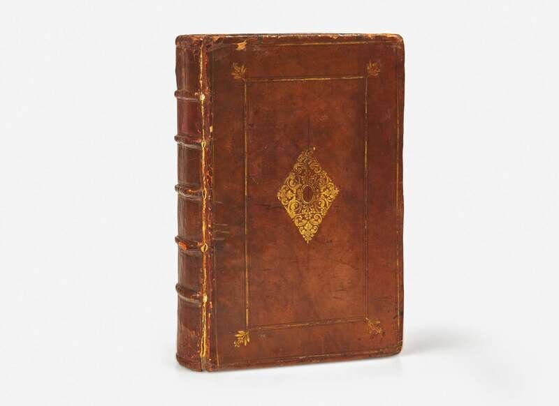 London: Edward Griffin, and Richard Whitaker, 1638. First edition, second issue (with Novum Organum). Thick 4to. (xiv), 386, (16), 475, (9), 360, 36, (2) pp. (many pages misnumbered); without separate title for Novum Organum, as usual. Illustrated with an engraved frontispiece portrait of Bacon. Full contemporary brown calf, stamped in blind and in gilt, front and rear joints and extremities worn; edges stained red; scattered light soiling to text. Gibson 197