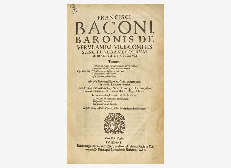 Scarce second issue of the first collected works of Francis Bacon in Latin. This issue notably includes at the end the unsold sheets of the 1620 first edition of Bacon's great work on the scientific method, Novum Organum (see Gibson 103b). Part of his larger incomplete magnum opus, Instauratio Magna, Bacon sought “for the reorganization of scientific method and gave purposeful thought to the relation of science to public and social life,” and insisted on “making science experimental and factual rather than speculative and philosophical.” (Printing and the Mind of Man, p. 72)