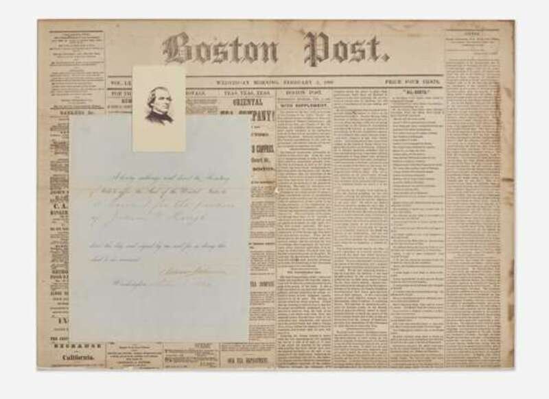 Washington, (D.C.), February 4, 1869. Partially-printed document, signed by President Andrew Johnson, being a warrant for the pardon of Judson J. Hough; 10 x 8 in. (254 x 203 mm). Creasing from old folds; mounted to a sheet from an 1868 edition of the Boston Post, with carte de visite of Johnson mounted to top of document. In frame, 16 1/2 x 22 in. (419 x 559 mm).