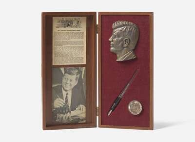 Washington, D.C., October 7, 1963. Steel-nib fountain ink pen by Esterbrook, black plastic grip and translucent plastic handle; engraved in white “The President-The White House”. In folding wooden presentation case, with brass portrait profile of Kennedy, small silver medallion, photographic portrait of Kennedy, and descriptive placard. Pen lightly worn. From the Forbes Collection.