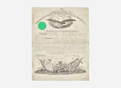 Washington, (D.C.), August 6, 1861. Partially-printed military commission on vellum, signed by President Abraham Lincoln, appointing George B. Butler Second Lieutenant in the Third Regiment of Infantry; counter-signed by Acting Secretary of War, Thomas A. Scott. Green seal intact in upper left; Adjutant General's manuscript in top left corner. Creasing from contemporary folds; tape residue on verso edges from old mount. 17 1/2 x 13 3/4 in. (444 x 349 mm).