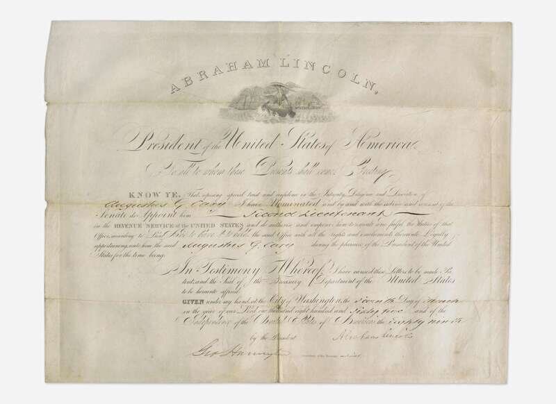 Washington (D.C.), March 7, 1865. Partially-printed commission on vellum, signed by Abraham Lincoln as President of the United States, appointing Augustus G. Carey a Second Lieutenant in the Revenue Service of the United States; counter-signed by Secretary of the Treasury ad interim, George Harrington; embossed stamp in bottom left. Creasing from old folds, wear and soiling along same; small open tears at top and bottom central vertical fold; creasing and light wear in top left corner. 13 3/4 x 17 3/4 in. (349 x 451 mm).