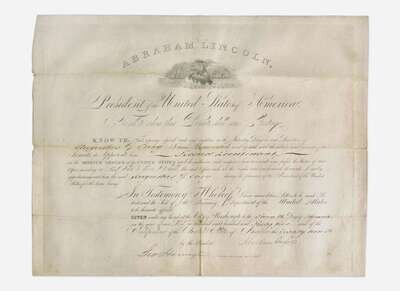A handsome commission signed by President Abraham Lincoln just five weeks before his assassination, appointing Augustus G. Carey a Second Lieutenant in the Revenue Service. Carey served with distinction in the Revenue Cutter Service during the Civil War, bearing witness to the famous clash of the Monitor and Merrimac at the Battle of Hampton Roads on March 8, 1862. He was an officer aboard the great steamship Great Eastern before his retirement in 1874.