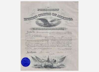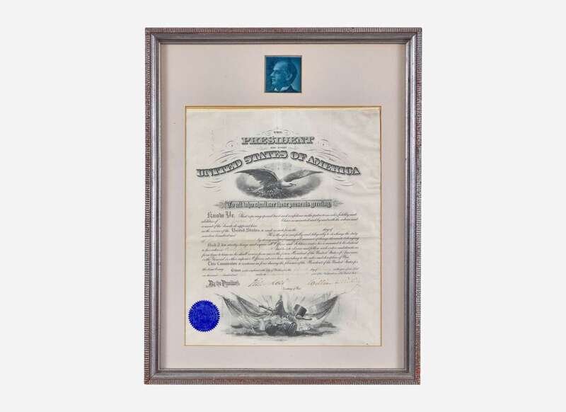 Washington, (D.C.), February 15, 1901. Partially-printed military commission on vellum, signed by President William McKinley, appointing Justus M. Brown Assistant Surgeon General with the rank of Colonel in the service of the United States; counter-signed by Secretary of War Elihu Root. Blue paper seal intact at bottom left. Approximately 18 x 15 in. (457 x 381 mm) (sight). In mat with portrait of McKinley, and unexamined out of frame, 26 5/8 x 20 5/8 (676 x 524 mm).