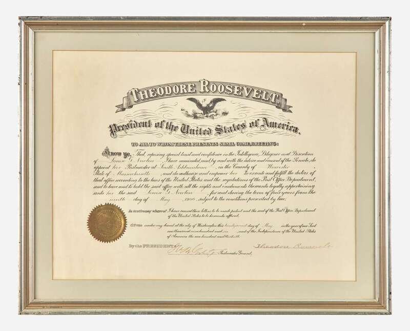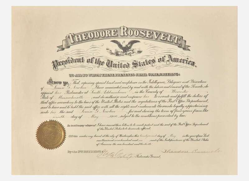 Washington, (D.C.), May 22, 1906. Partially-printed document, signed by President Theodore Roosevelt, appointing Louise G. Newton Postmaster at South Ashburham in the County of Worcester, Massachusetts; counter-signed by Postmaster General George B. Cortelyou. Gold seal intact in bottom left. Approximately 15 x 20 (381 x 508 mm) (sight). In mat, and unexamined out of frame, 19 3/8 x 24 3/8 in. (492 x 619 mm).