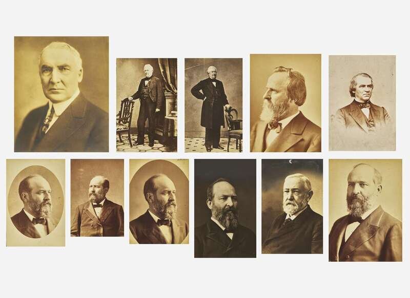 Various locations, ca. late 19th century. Comprising 11 photos, including two of Millard Fillmore (by Brady, not credited), one cabinet card of Andrew Johnson (New York: Charles L. Ritzman); one cabinet card of Rutherford B. Hayes (New York: Sarony); five of James Garfield (Cleveland: J.F. Ryder; New York: A. Bogardus; three uncredited; three cabinet cards and two silver prints); one silver print of Benjamin Harrison (uncredited); one silver print of Warren G. Harding (uncredited). From the collection of Hungarian-American photojournalist Stefan Lorant, with his credit stamp on verso of several photographs ("Stefan Lorant Collection"). Each photo mounted to board; eight photos with ink inscription on mounting board; five photos with ink inscription on verso.