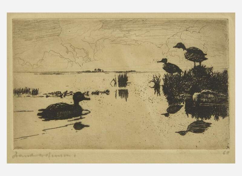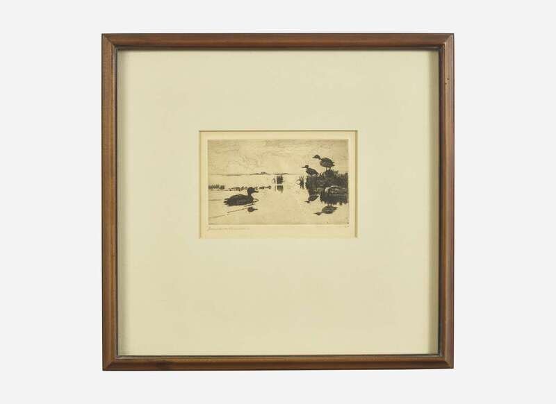 1918. Etching with drypoint, signed and numbered by Benson at bottom; #68/150. 9 x 11 1/2 in. (229 x 292 mm). Mat burn. In mat and in frame, 12 x 12 3/8 in. (305 x 314 mm). From the sporting library of American adventurer, naturalist, and sportsman, Brooke Dolan II. Paff 145