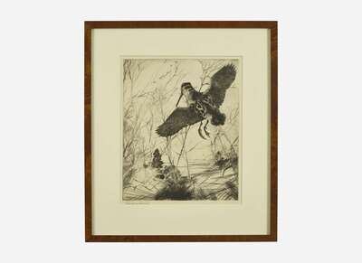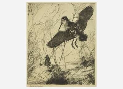 1930. Drypoint with etching, signed by Benson bottom left. From an edition of 150. 15 1/4 x 12 3/4 in. (387 x 324 mm). In mat and in frame, 18 1/2 x 16 in. (470 x 406 mm). From the sporting library of American adventurer, naturalist, and sportsman, Brooke Dolan II. Paff 292