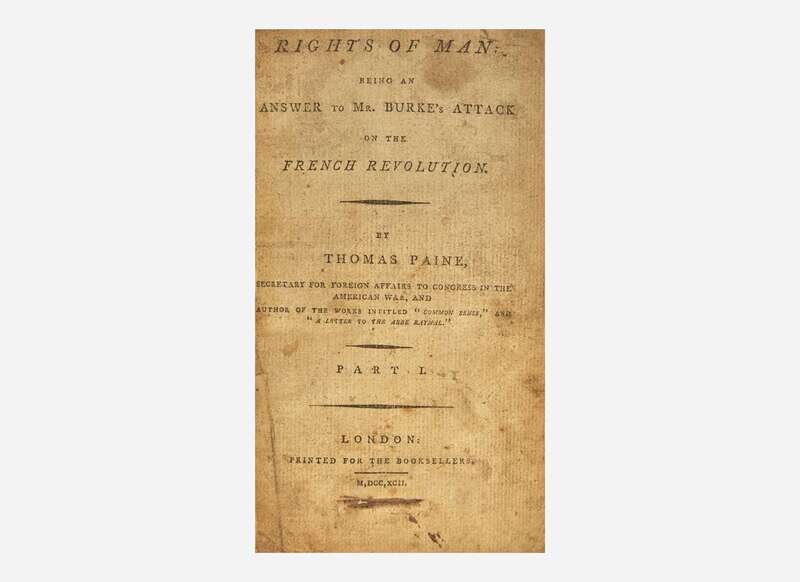 Scarce early collected edition of Thomas Paine's Rights of Man, in a contemporary binding. First printed in London by Joseph Johnson in March, 1791, publication was quickly taken over by J.S. Jordan, who published his own revised edition later that same year. Part two was published a year later, in February, 1792. Paine's defense of the French Revolution and republicanism in general was very controversial, and led to the text's censorship by the Pitt government, as well as Paine's indictment for treason. Tried in absentia, he was found guilty of seditious libel and was forced to flee to France. Despite the text's permanent suppression by the British government, Paine's text still managed to reach a wide audience, going through numerous editions and translations.