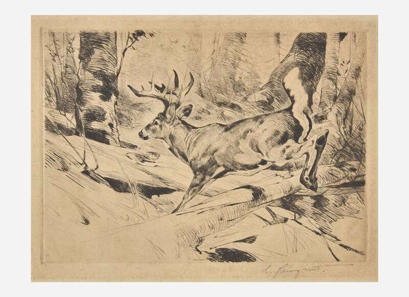 Circa 1935. Etching, signed by Rungius in pencil bottom right. 9 3/4 x 13 in. (248 x 330 mm). Lightly toned. In mat. From the sporting library of American adventurer, naturalist, and sportsman, Brooke Dolan II.
