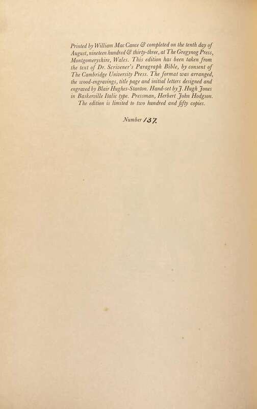 One of the finest works published by the Gregynog Press. Printed by William MacCance, with text from Dr. Scrivener's Paragraph Bible, and designed and engraved by Blair Hugh-Stanton, and hand-set by J. Hugh Jones in Baskerville Italic type.