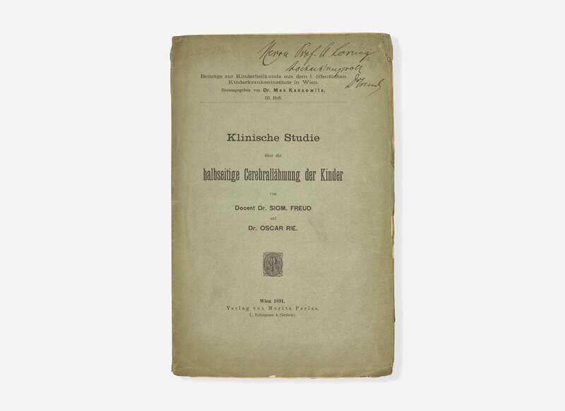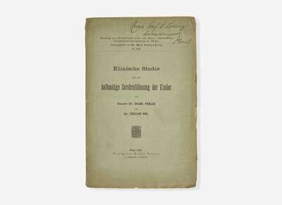 Rare presentation copy of Sigmund Freud and Oscar Rie's early work on child neurology, inscribed to Viennese orthopedic surgeon Adolf Lorenz (1854-1946). Lorenz is remembered for his non-invasive surgical techniques and work with bone deformities, which included treatments for congenital hip dislocation in children, club feet, and scoliosis.