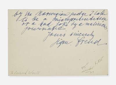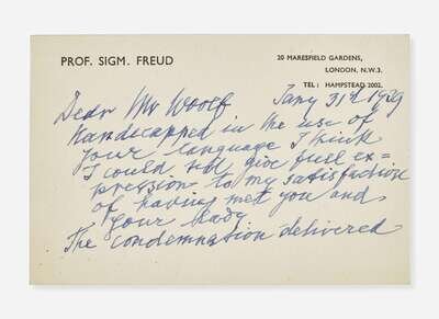 London, January 31, 1939. Single oblong card, 3 1/2 x 5 1/4 in. (89 x 133 mm). Autograph letter in English, signed by Sigmund Freud to Leonard Woolf regarding their recent and only meeting: "Dear Mr. Woolf, Handicapped in the use of your language I think I could not give full expression to my satisfaction of having met you and your lady [Virginia Woolf]. The condemnation delivered by the Norwegian judge I take to be a misrepresentation or a bad joke by a malicious journalist. Yours sincerely Sigm. Freud." On Freud's personal 20 Maresfield Gardens stationery.
