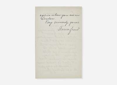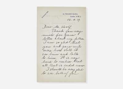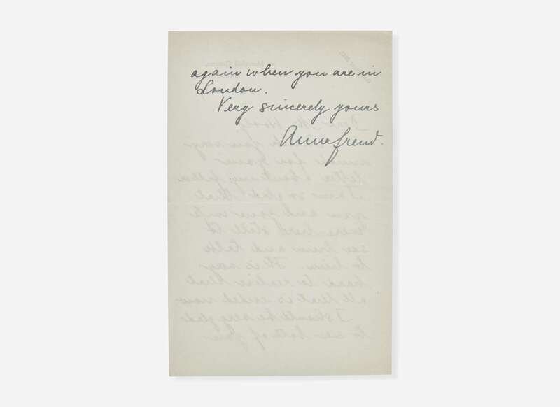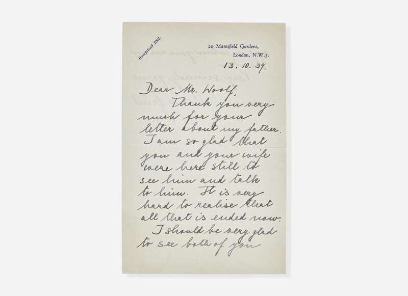Lot also includes an autograph letter, signed by Freud's daughter, Anna Freud, to Leonard, dated October 13, 1939: “Dear Mr. Woolf, Thank you very much for your letter about my father. I am so glad that you and your wife were here still I'd see him and talk to him. It is very hard to realise that all that is ended now. I should be very glad to see both of you again when you are in London. Very sincerely yours Anna Freud.”